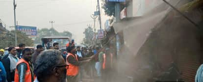 फुटपाथ से अतिक्रमण हटाते पालिका कर्मी।