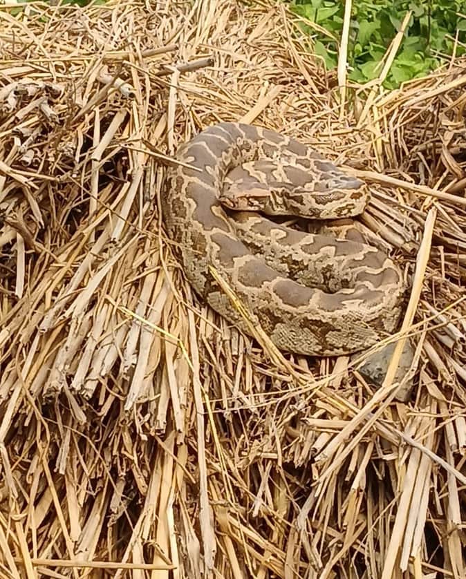 चौबेपुर गांव में धान की पराली पर बैठा अजगर।