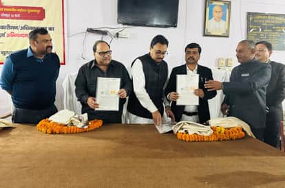 न्यायालय सभागार में बैठक करके बार एसोसिएशन को स्टैंड की जिम्मेदारी से संबंधित कागजात देते विध