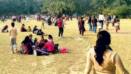 पार्क में धूप का आनंद लेते लोग