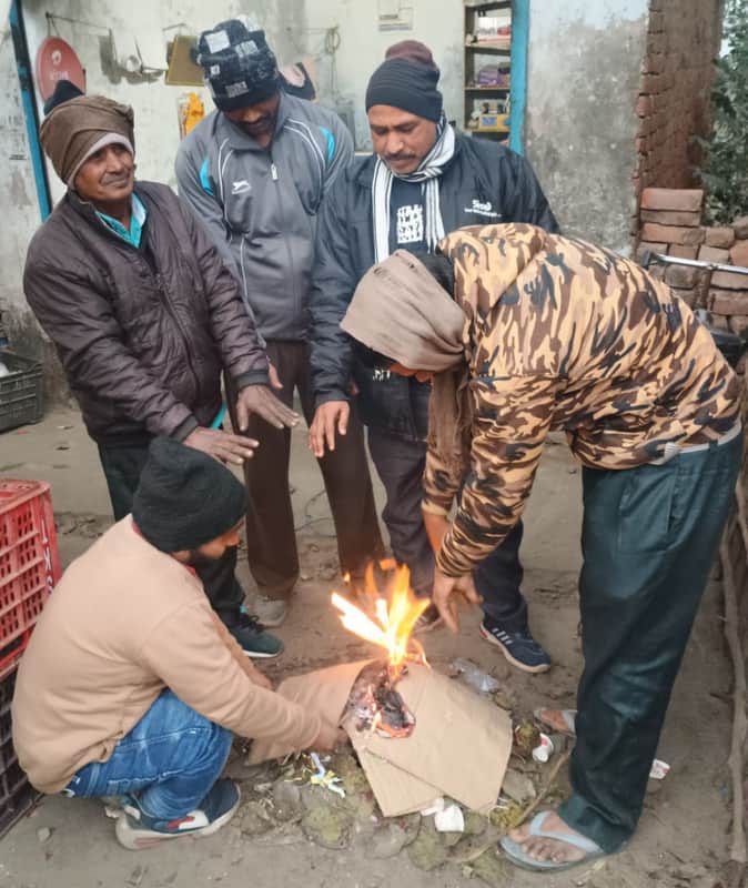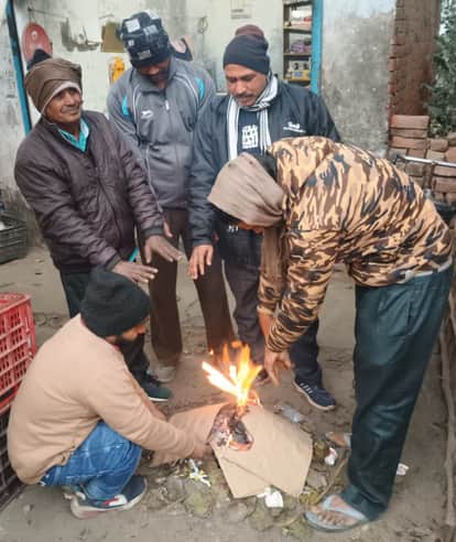 कुड़वार कस्बे में रविवार को गत्ता जलाकर हाथ सेंकते लोग। संवाद