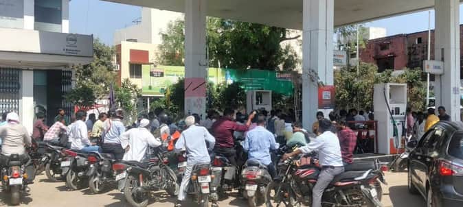 शहर के बस स्टेशन स्थित पेट्रोल पंप पर पेट्रोल लेने के लिए लगी भीड़। स्रोत-सोशल मीडिया
