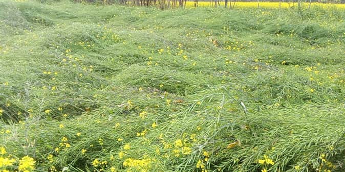 बल्दीराय क्षेत्र में हवा और बारिश से गिरी सरसों की फसल। संवाद
