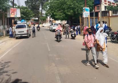 स्कूल की छुट्टी होने के बाद सोमवार दोपहर सिर पर दुपट्टा ओढ़कर जाती छात्राएं। संवाद