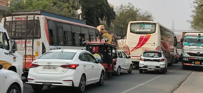 सड़क पर लगी वाहनों की कतार
