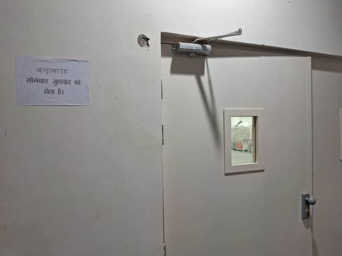 मेडिकल कॉलेज में भूतल पर अल्ट्रासाउंड सेंटर के बाहर चस्पा नोटिस। संवाद