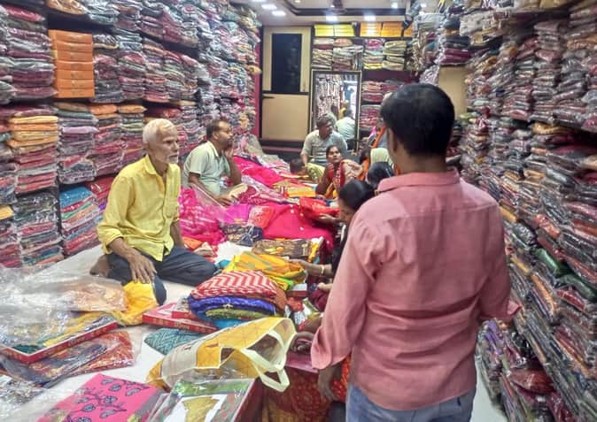 शहर में कपड़ा की दुकान पर साड़ियां पसंद करतीं महिलाएं। संवाद