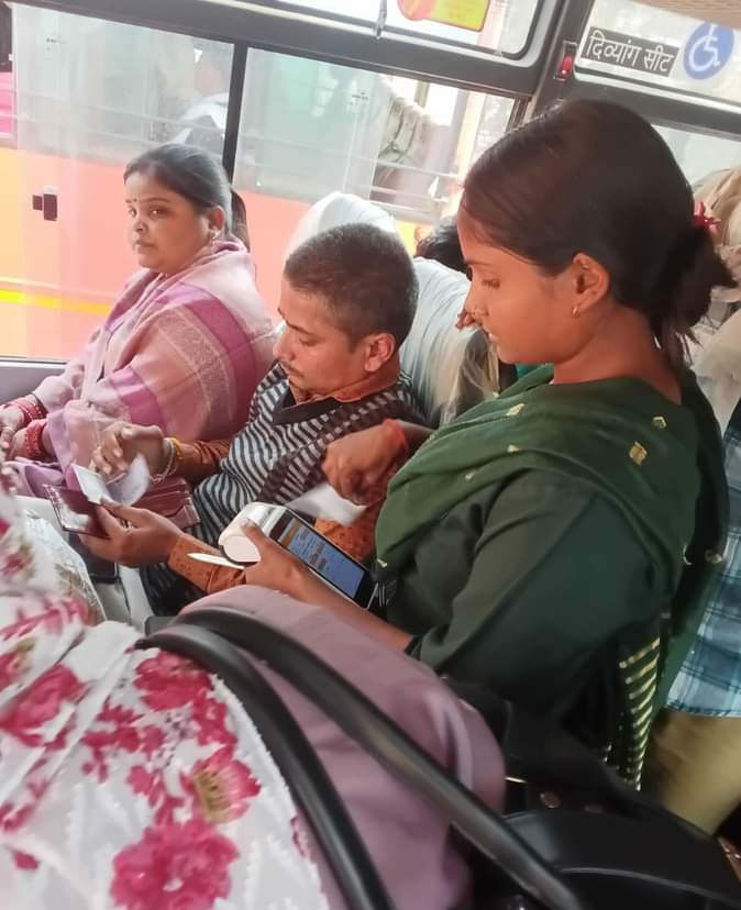 रोडवेज बस स्टेशन पर बस के अंदर यात्रियों काे टिकट देती देतीमहिला परिचालक।
