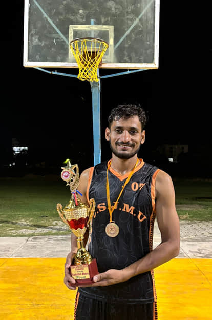 फोटो:16: ट्राफी के साथ बॉस्केटबाल कोर्ट में मौजूद अमित त्रिपाठी। संवाद