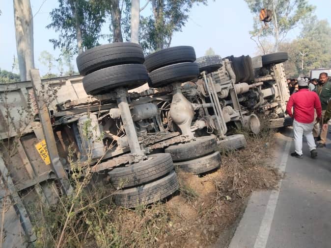 Unnao News: डस्ट लदा ट्रक खंती में पलटा, तीन घायल