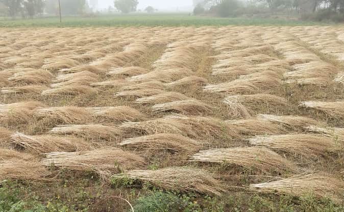 फोटो-19 गंजमुरादाबाद में हसनापुर चौराहे के पास खेत में कटी पड़ी सरसों की फसल। संवाद।