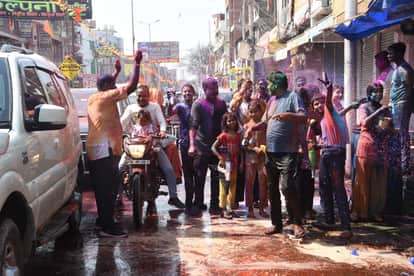 फोटो-10- शहर के बड़ा चौराहा पर रंग खेलते लोग। संवाद