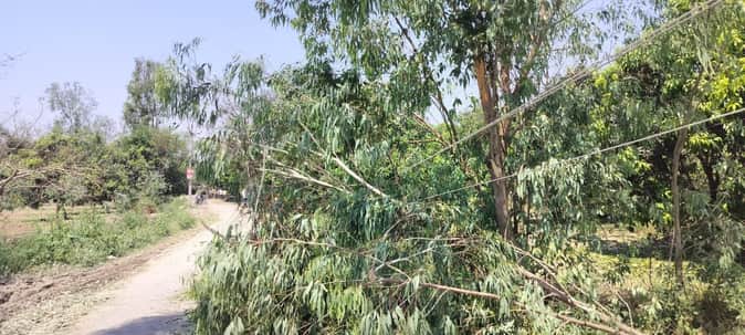 फोटो-11कादिरपुर-हैदराबाद संपर्क मार्ग पर गिरे शीशम के पेड़ में फंसे बिजली के तार। संवाद