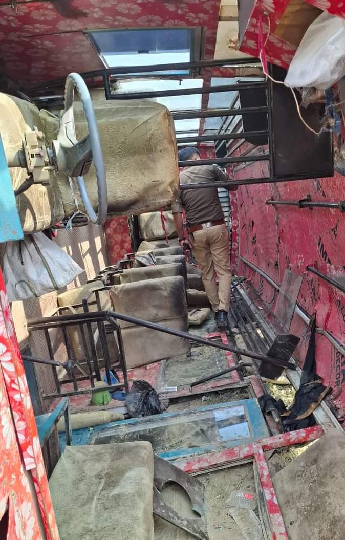 फोटो-15- पलटी बस के अंदर यात्रियों के सामान की जांच करता सिपाही। संवाद