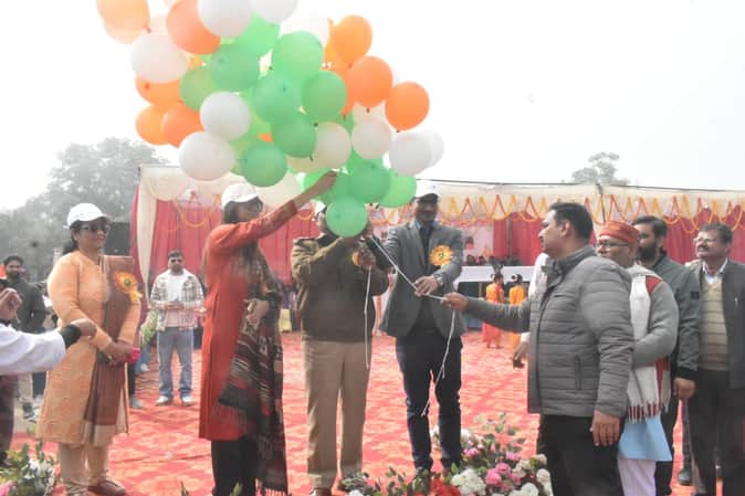 फोटो-33 गुब्बारा उड़ाकर बाल क्रीड़ा प्रतियागिता एवं सांस्कृतिक समाराेह की शुरुआत करतीं सीडीओ कृ- फोटो : 1