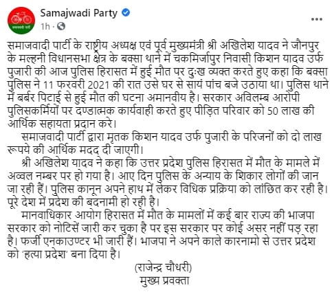 राजेंद्र चौधरी ने कहा कि पुलिस की बर्बर पिटाई से युवक की मौत बेहद अमानवीय घटना है। सपा पीड़ित परिवार के प्रति गहरी संवेदना व्यक्त करती है। हिरासत में मौत के मामले में यूपी पुलिस अव्वल हो चुकी है। कानून अपने हाथ में लेकर विधिक प्रक्रिया को लांछित कर रही है। मानवाधिकार आयोग की नोटिस के बाद भी सरकार पर कोई असर नहीं है। सपा नेता डॉ. केपी यादव ने भी 50 लाख रुपये की सहायता राशि और दोषी पुलिसकर्मियों पर हत्या का मुकदमा दर्ज करने की मांग की। उधर, युवक की मौत के मामले में शुक्रवार देर शाम बक्शा एसओ और एसओजी टीम के खिलाफ मुकदमा दर्ज हुआ।