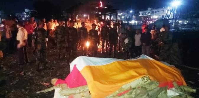बागेश्वर। ललितपुर रेलवे स्टेशन के पास बरामद हुए बंगाल इंजीनियरिंग के सूबेदार की सैन्य सम्मान के साथ अंत्येष्टि कर दी गई है। बेंगलुरू से घर लौटते समय वह ट्रेन से लापता हो गए थे। बुधवार को उनका शव बरामद हुआ था। बृहस्पतिवार की रात को सरयू-गोमती के संगम पर उनका अंतिम संस्कार किया गया।