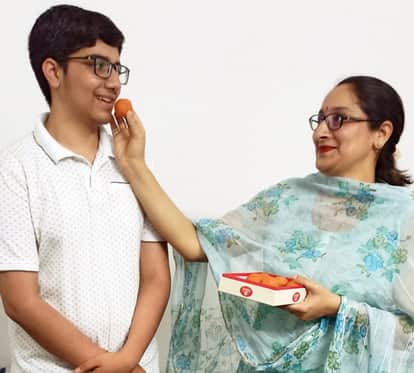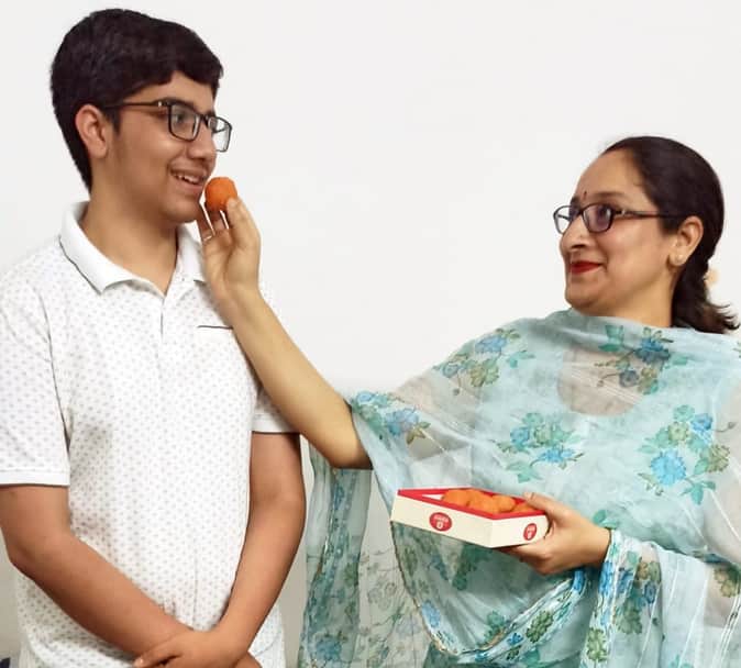 गोपेश्वर के क्राइस्ट एकेडमी के छात्र स्मयन कोे को मिठाई खिलातीं उसकी माता। स्रोत: विद्यालय प्र