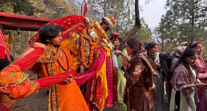 गोपेश्वर के ठेली गांव में अपने भक्तों को आशीर्वाद देतीं मां नंदा की डोली। स्रोत: जागरुक पाठक