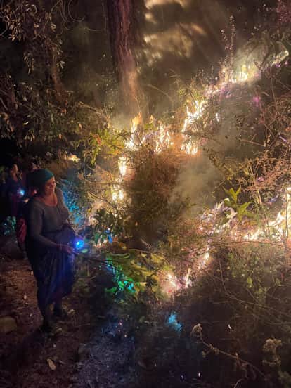 कर्णप्रयाग के खगेली गांव में गोशाला के समीप पहुंची जंगल की आग, बुझाने में जुटे लोग। स्रोत : जाग
