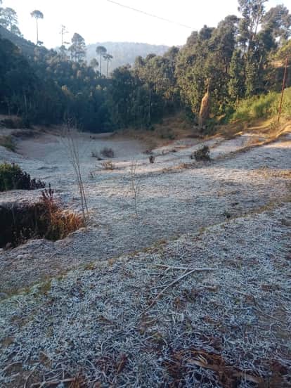 चंपावत के ग्राम सभा गौली क्षेत्र के खेतों में भारी मात्रा में पड़ा पाला। संवाद