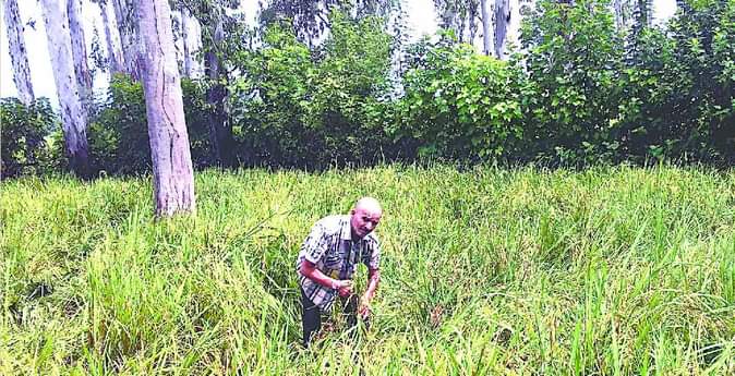 हाथियों के झुंड द्वारा रौंदी गई धान की फसल दिखाता काश्तकार।