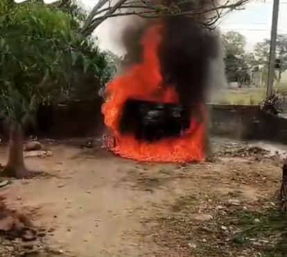 ज्वालापुर में खड़ी कार में लगी आग। स्त्रोत: वीडियो ग्रैब।