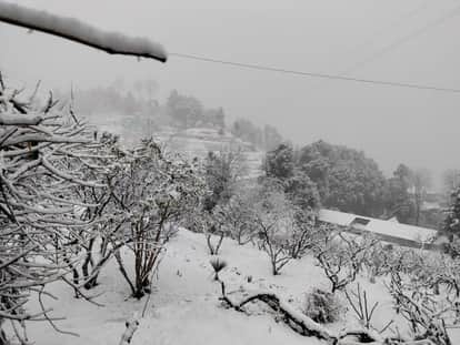 मुक्तेश्वर में बर्फबारी के बाद सेब के बगीचे बर्फ की चादरों से ढके हुए। संवाद
