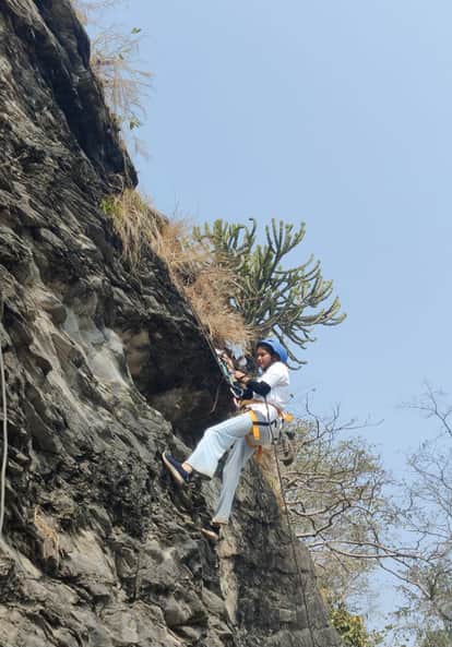 देवप्रयाग में चट्टान आरोहण करती युवती l संवाद