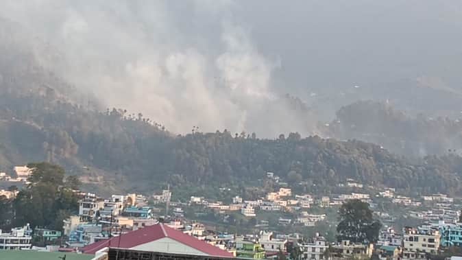 पिथौरागढ़ स्थित गैना जंगल से उठ रहा आग का धुंआ। संवाद