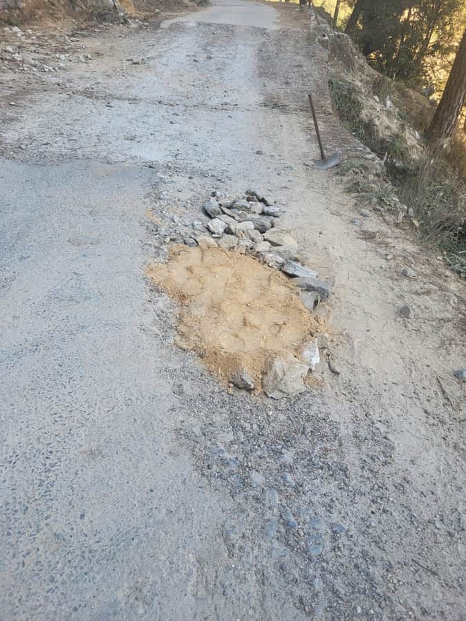 सीणी-चामा सड़क पर डामर के बदले मिट्टी से भरे गए गड्ढे। स्रोत : ग्रामीण