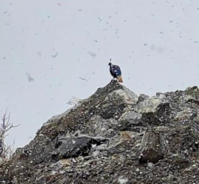 दारमा घाटी के ग्राम बालिंग में बर्फबारी के बीच हिमालयन मोनाल। स्रोत : गुड्डू जंग