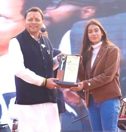 दिल्ली के रोहणी में आयोजित महोत्सव के समापन पर स्नेहा बिष्ट को अवार्ड देते मुख्यमंत्री पुष्कर स