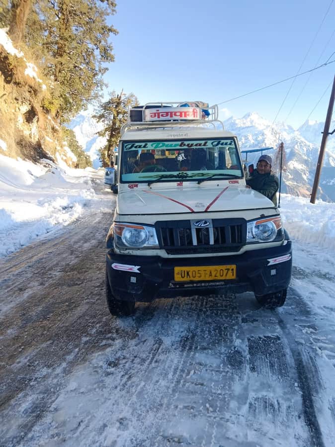 थल-मुनस्यारी सड़क पर जमा बर्फ और बमुश्किल आवाजाही करती जीप। स्रोत:टैक्सी संचालक।