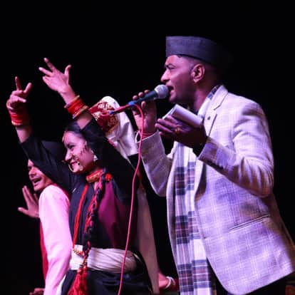 मुनस्यारी महोत्सव में गीत प्रस्तुत करते लोकगायक ललित मोहन जोशी और नृत्य करते कलाकार। संवाद