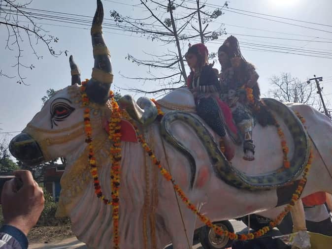 05- वीरभद्र महादेव मंदिर से निकाली गई शोभायात्रा में बैल पर सवार शिव पार्वती की वेषभूषा में सज