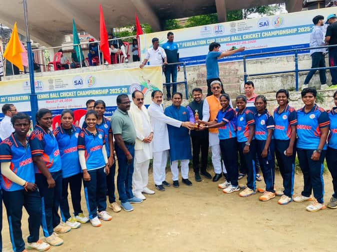 नेहरू स्टेडियम में फेडरेशन कप टेनिस बॉल क्रिकेट चैंपियनशिप के समापन पर खिलाड़ियों को सम्मानित