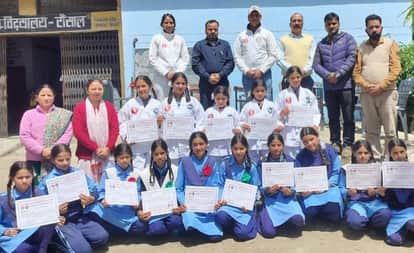 घनसाली रौंसाल हाईस्कूल में ताइक्वांडो प्रशिक्षण छात्राओं को वितरित किए गए प्रमाणपत्र। स्रोत जा