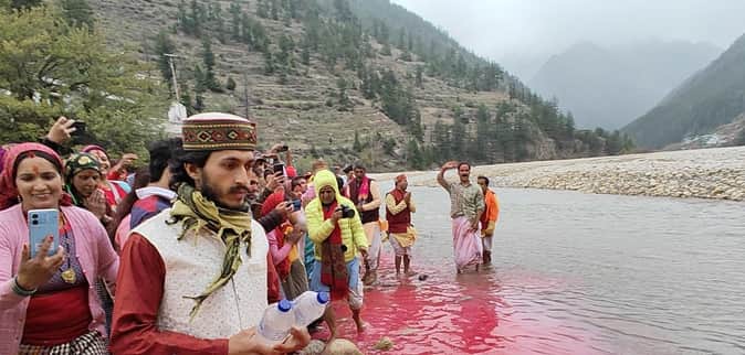 गंगा सप्तमी पर्व पर मार्कण्डेय पुरी मुखबा गांव में भागीरथी नदी की पूजा अर्चना करते श्रद्धालु। स