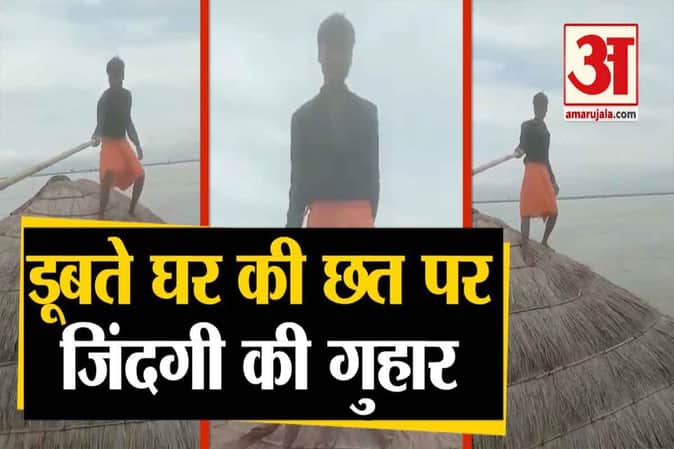 due to heavy rain in bihar video of a man standing on hut stuck in flood