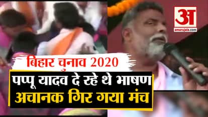 जन अधिकार पार्टी के अध्यक्ष पप्पू यादव एक चुनावी रैली के दौरान मंच से गिर गए। ये वीडियो बिहार के मुजफ्फरपुर का है जहां मीनापुर विधानसभा क्षेत्र में भाषण देते हुए पप्पू यादव और उनके कार्यकर्ताओं के साथ अचानक मंच गिरने की घटना हुई।