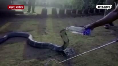 प्रचंड गर्मी ने पूरे देश को अपनी चपेट में ले लिया है। क्या इंसान और क्या जानवर सभी गर्मी से परेशान है। इसी गर्मी का मारा एक किंग कोबरा कर्नाटक के कइगा में देखा गया जो बेतहाशा गर्मी की वजह से अपने बिल से बाहर निकला और रिहायशी इलाके में घुस आया। फॉरेस्ट रेंजर्स ने इस किंग कोबरा को काबू में किया और शायद उन्हें ऐहसास हुआ कि किंग कोबरा प्यासा है। इसके बाद किंग कोबरा को फॉरेस्ट रेंजर्स ने बोतल से पानी पिलाया और किंग कोबरा ने अपना फन फैलाकर, जीभ लपलपाकर पानी पिया भी। इंसान के हाथ से बोतल से पानी पीते इस किंग कोबरा का वीडियो तेजी से वायरल हो रहा है।