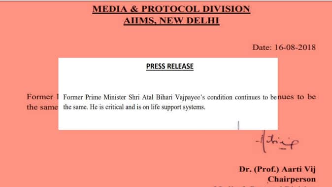 अटल बिहारी वाजपेयी की हालत अभी भी गंभीर बनी हुई है। देखिए AIIMS ने अपने ताजा मेडिकल बुलेटिन में क्या लिखा है।