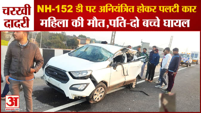 चरखी दादरी:NH-152 डी पर अनियंत्रित होकर पलटी कार,महिला की मौत,पति-दो बच्चे घायल