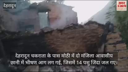 देहरादून चकराता के पास मोठी में दो मंजिला आवासीय छानी में भीषण आग लग गई, जिसमें 14 पशु जिंदा जल गए। तहसील क्षेत्र के ग्राम पंचायत मोठी के मशौक मजरे में स्थित ग्रामीण मांन्नु और पप्पू के आवासीय दो मंजिला छानी में देर रात्रि को आग लग जाने से 14 जिंदा पशुओं की जलकर मौत हो गई। साथ ही छानी में रखें अनाज और खाने पिने खाने की वस्तुए भी राख हो गई। आग लगने के कारणों का पता करने के लिए क्षेत्रीय पटवारी मौके के लिए रवाना।