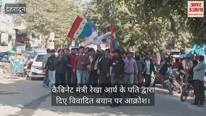 कैबिनेट मंत्री रेखा आर्य के पति द्वारा दिए विवादित बयान पर आक्रोश। विरोध में यमुना कॉलोनी स्थित मंत्री आवास के बाहर एनएसयूआई छात्र संगठन के सदस्यों का प्रदर्शन।