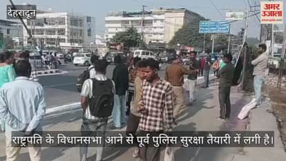 राष्ट्रपति के विधानसभा आने से पूर्व पुलिस सुरक्षा तैयारी में लगी है। रिस्पना पुल पर होने वाली मजदूरों की भीड़ को पुलिसकर्मियों ने हटाया। राज्य स्थापना के 25 वर्ष पूरे होने पर रजत जयंती के उपलक्ष्य पर विधानसभा का विशेष सत्र सोमवार से शुरू होगा। राष्ट्रपति द्रौपदी मुर्मू के अभिभाषण से सत्र की शुरुआत होगी। विशेष सत्र के लिए राष्ट्रपति रविवार दोपहर दून पहुंच गईं हैं।