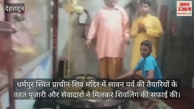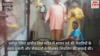 धर्मपुर स्थित प्राचीन शिव मंदिर में सावन पर्व की तैयारियों के तहत पुजारी और सेवादारों ने मिलकर शिवलिंग की सफाई की। भक्तों के लिए मंदिर को सजाया जा रहा है।