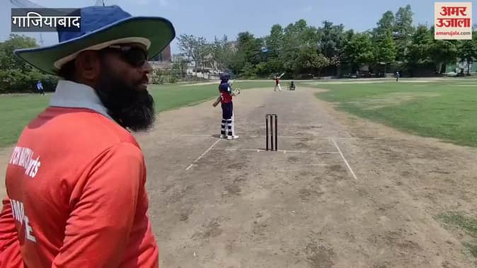 गाजियाबाद में द्वितीय पुष्पा मेमोरियल अंडर 13 क्रिकेट टूर्नामेंट, शॉट लगाते खिलाड़ी देव भाटी