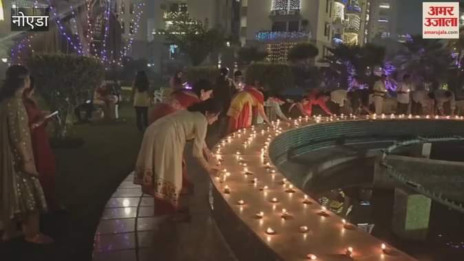 नोएडा सेक्टर-93 में दीपों की छटा के साथ उत्सव मनाते लोग